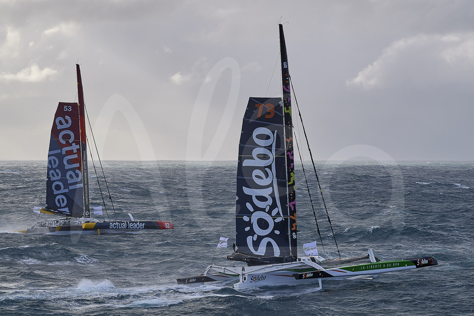 | Description | BREST, FRANCE - NOVEMBER 05: Actual Leader and Sodebo Ultim 3 are taking the start of the Brest Atlantiques duo sailing race on November 5, 2019 in Brest, France. Brest Atlantiques is reserved to Class Ultim 32/23, from Brest to Brest, via waypoints off Rio de Janeiro and Cape Town, without any stop. (Photo by Yvan Zedda/Alea) |