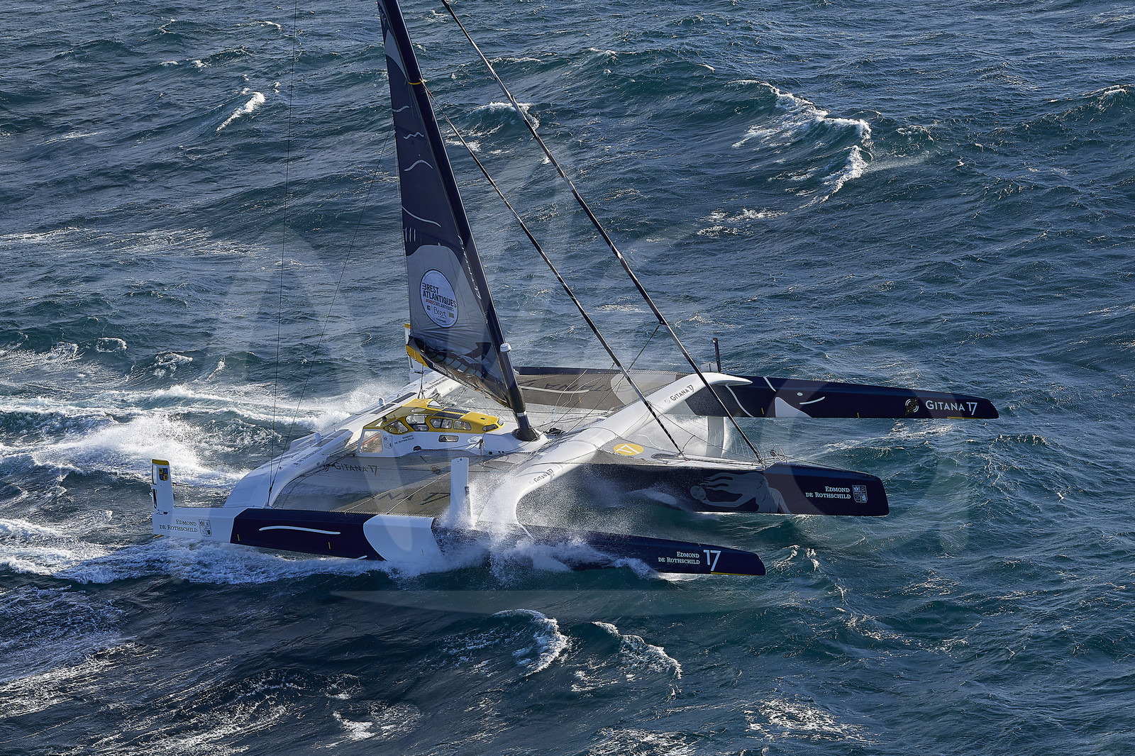 | Description | BREST, FRANCE - NOVEMBER 05: Maxi Edmond de Rothschild is taking the start of the Brest Atlantiques duo sailing race on November 5, 2019 in Brest, France. Brest Atlantiques is reserved to Class Ultim 32/23, from Brest to Brest, via waypoints off Rio de Janeiro and Cape Town, without any stop. (Photo by Yvan Zedda/Alea) |