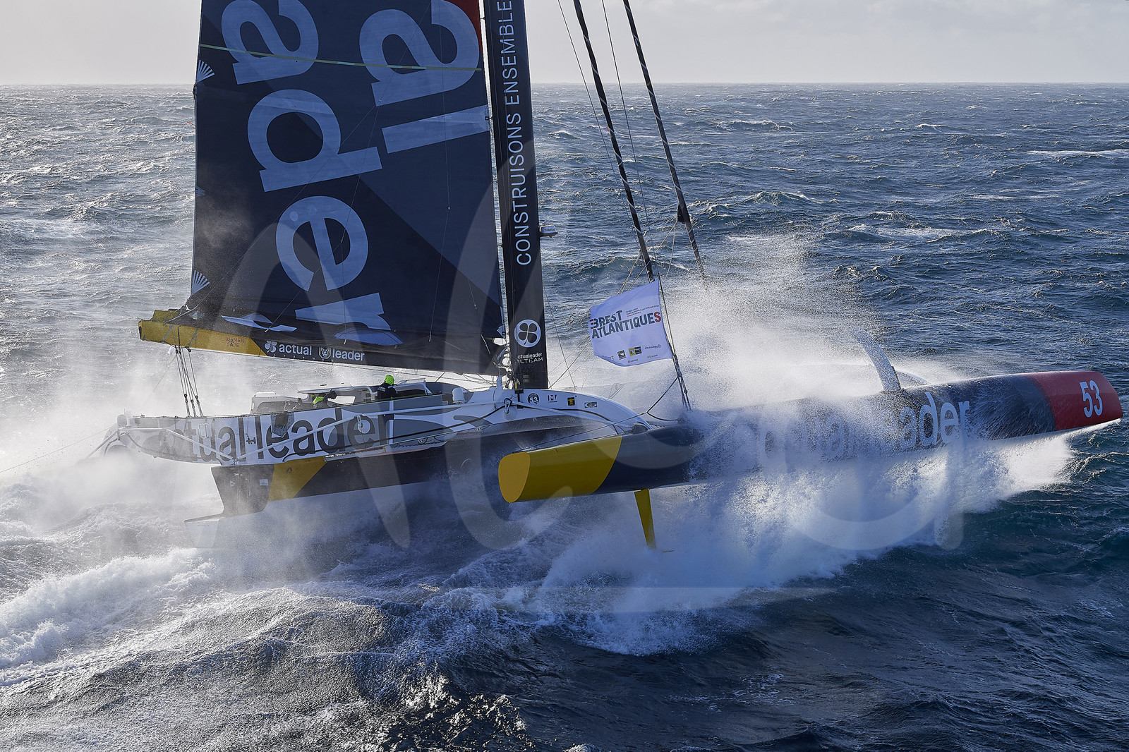 | Description | BREST, FRANCE - NOVEMBER 05: Actual Leader is taking the start of the Brest Atlantiques duo sailing race on November 5, 2019 in Brest, France. Brest Atlantiques is reserved to Class Ultim 32/23, from Brest to Brest, via waypoints off Rio de Janeiro and Cape Town, without any stop. (Photo by Yvan Zedda/Alea) |