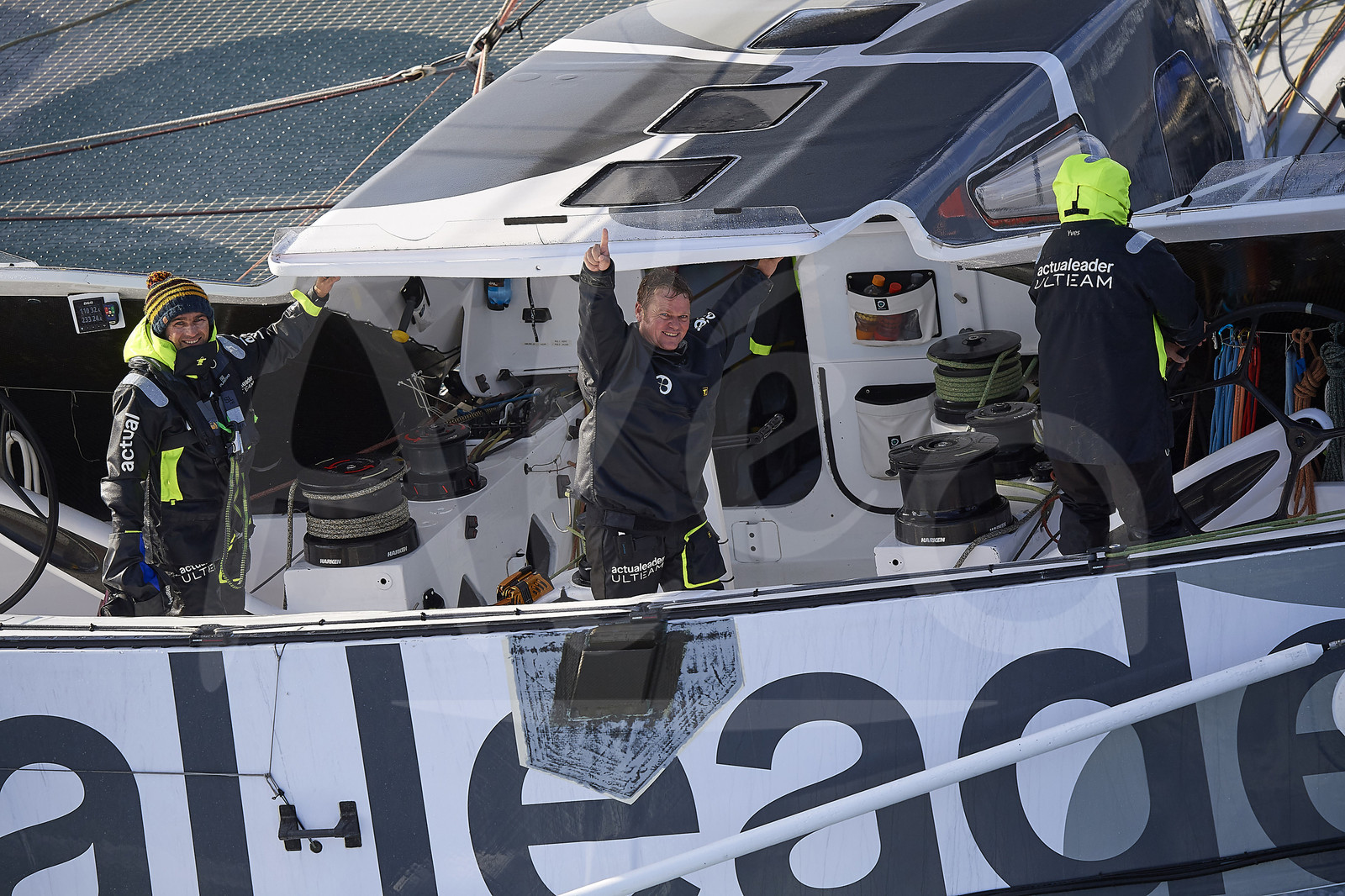 | Description | BREST, FRANCE - NOVEMBER 05: Actual Leader skippers Alex Pella is waving at photographer while taking the start of the Brest Atlantiques duo sailing race on November 5, 2019 in Brest, France. Brest Atlantiques is reserved to Class Ultim 32/23, from Brest to Brest, via waypoints off Rio de Janeiro and Cape Town, without any stop. (Photo by Yvan Zedda/Alea) |