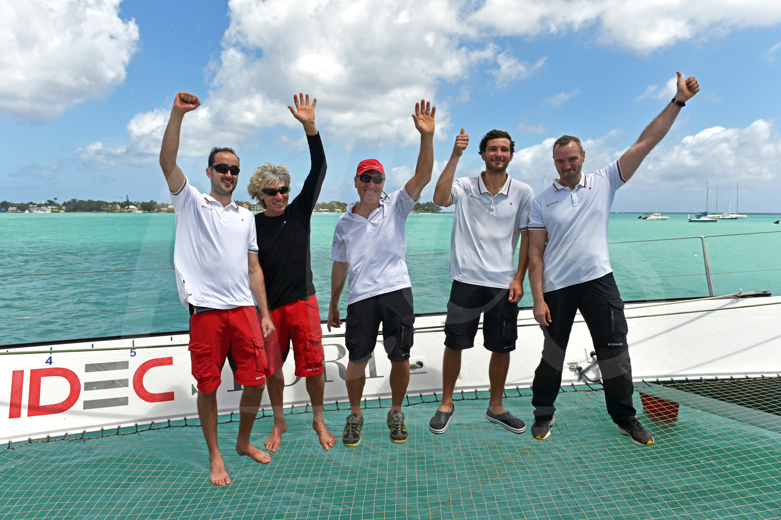 | Description | PORT-LOUIS, MAURITIUS - NOVEMBER 8: Maxi trimaran IDEC Sport french skipper Francis Joyon is posing on his boat with his crew, from left to right : Antoine Blouet, Christophe Houdet, Corentin Joyon and Bertrand Delesne, after breaking his own record of La Mauricienne in 19d 18h 14mn 45s, on November 8, 2019, in Grand Baie, Mauritius. La Mauricienne is a sailing route starting in Port-Louis, south brittany in France, to end in Port-Louis, Mauritius. (Photo by Fred Cusin/Alea) |
