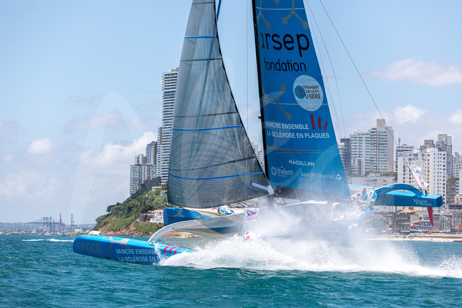 | Description | SALVADOR DE BAHIA, BRAZIL - NOVEMBER 8: Solidaires en Peloton - Arsep skippers Thibault Vauchel-Camus and Fred Duthil take second place in the Multi 50 category of the Transat Jacques Vabre 2019 on November 8, 2019 in Bahia, Brazil. Transat Jacques Vabre is a transatlantic duo sailing race from Le Havre, France, to Salvador de Bahia, Brazil. (Photo by Jean-Marie Liot/ALeA) |