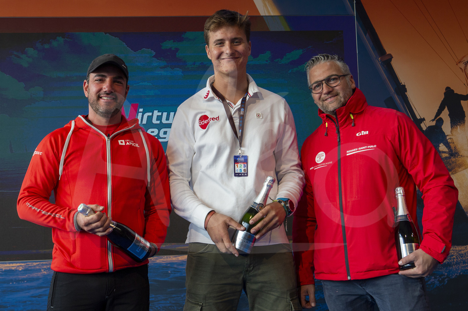 | Description | LE HAVRE, FRANCE - OCTOBER 19: Skipper Basile Bourgnon wins the e-sailing competition, while Damien Seguin takes 2nd place and Thibault Hector 3rd place during pre-start of the Transat Jacques Vabre 2019, duo sailing race from Le Havre, France, to Salvador de Bahia, Brazil, on October 19, 2019 in Le Havre, France. (Photo by Jean-Marie Liot/Alea) |