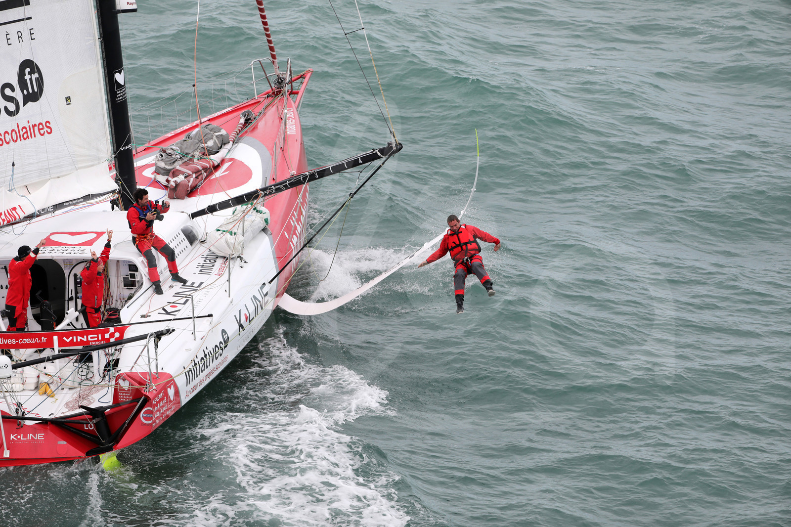 | Description | LE HAVRE, FRANCE - OCTOBER 27: A crew member of Imoca Initiatives Coeur is jumping into the water from the outrigger to leave the boat prior to the start of the Transat Jacques Vabre 2019, duo sailing race from Le Havre, France, to Salvador de Bahia, Brazil, on October 27, 2019 in Le Havre, France. (Photo by Jean-Marie Liot/Alea) |