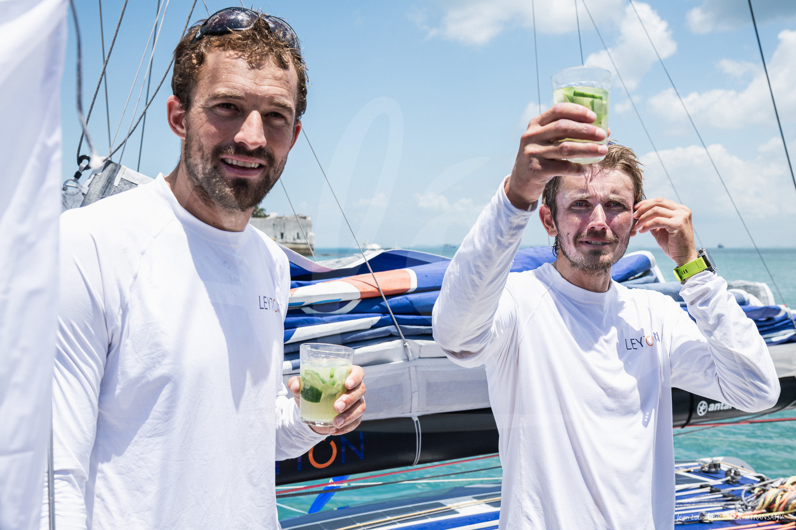 | Description | SALVADOR DE BAHIA, BRAZIL - NOVEMBER 14: Leyton skippers Fabien Delahaye and Sam Goodchild celebrate with caipirinha taking 2nd place in the Class 40 category of the Transat Jacques Vabre 2019 on November 14, 2019 in Bahia, Brazil. Transat Jacques Vabre is a duo sailing race from Le Havre, France, to Salvador de Bahia, Brazil. (Photo by Jean-Louis Carli/Alea) |