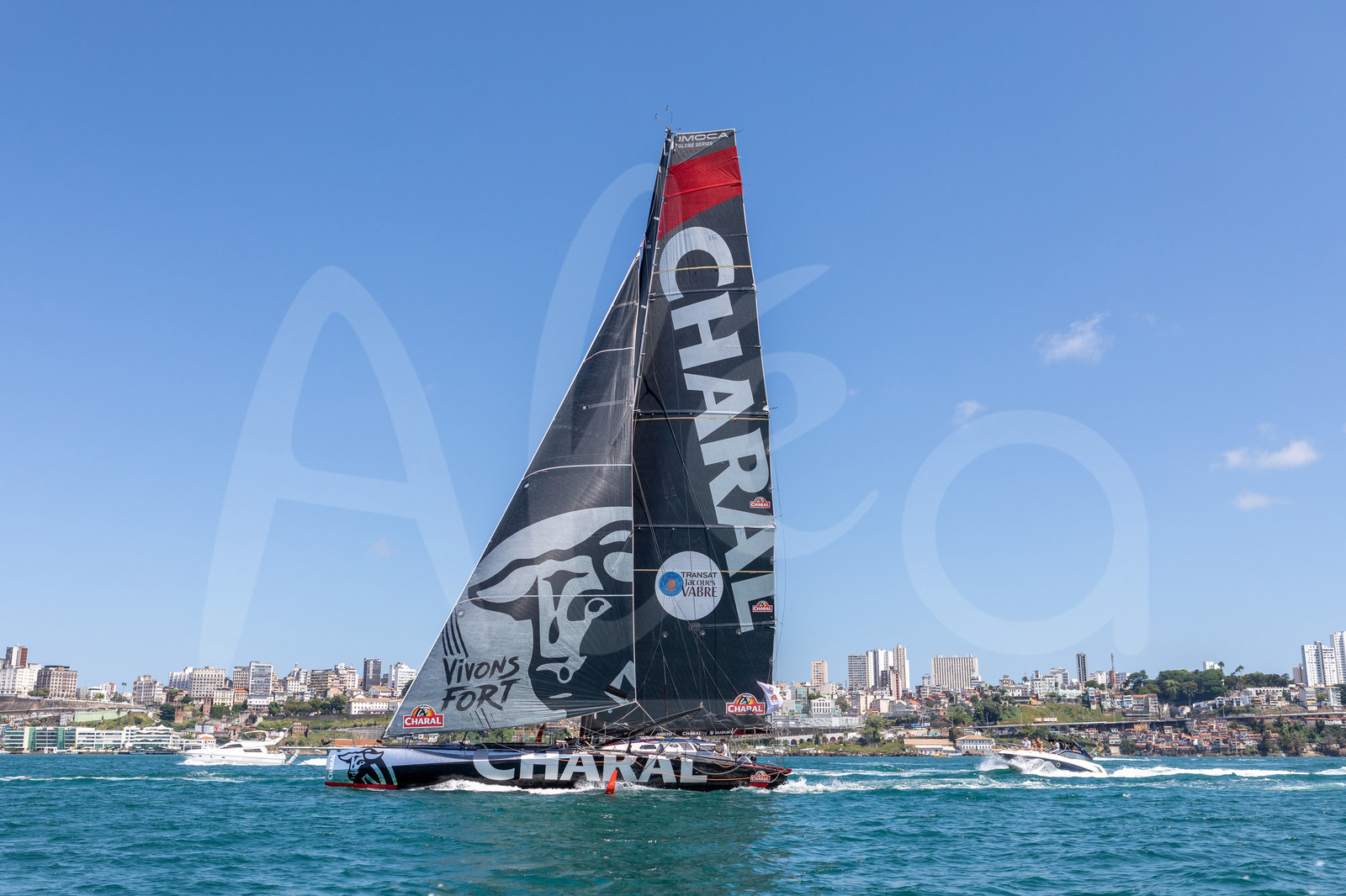 DescriptionSALVADOR DE BAHIA, BRAZIL - NOVEMBER 10: Charal skippers Jeremie Beyou and Christopher Pratt take 3rd place of the Imoca category of the Transat Jacques Vabre 2019 on November 10, 2019 in Bahia, Brazil. Transat Jacques Vabre is a duo sailing race from Le Havre, France, to Salvador de Bahia, Brazil. (Photo by Jean-Marie Liot/Alea)