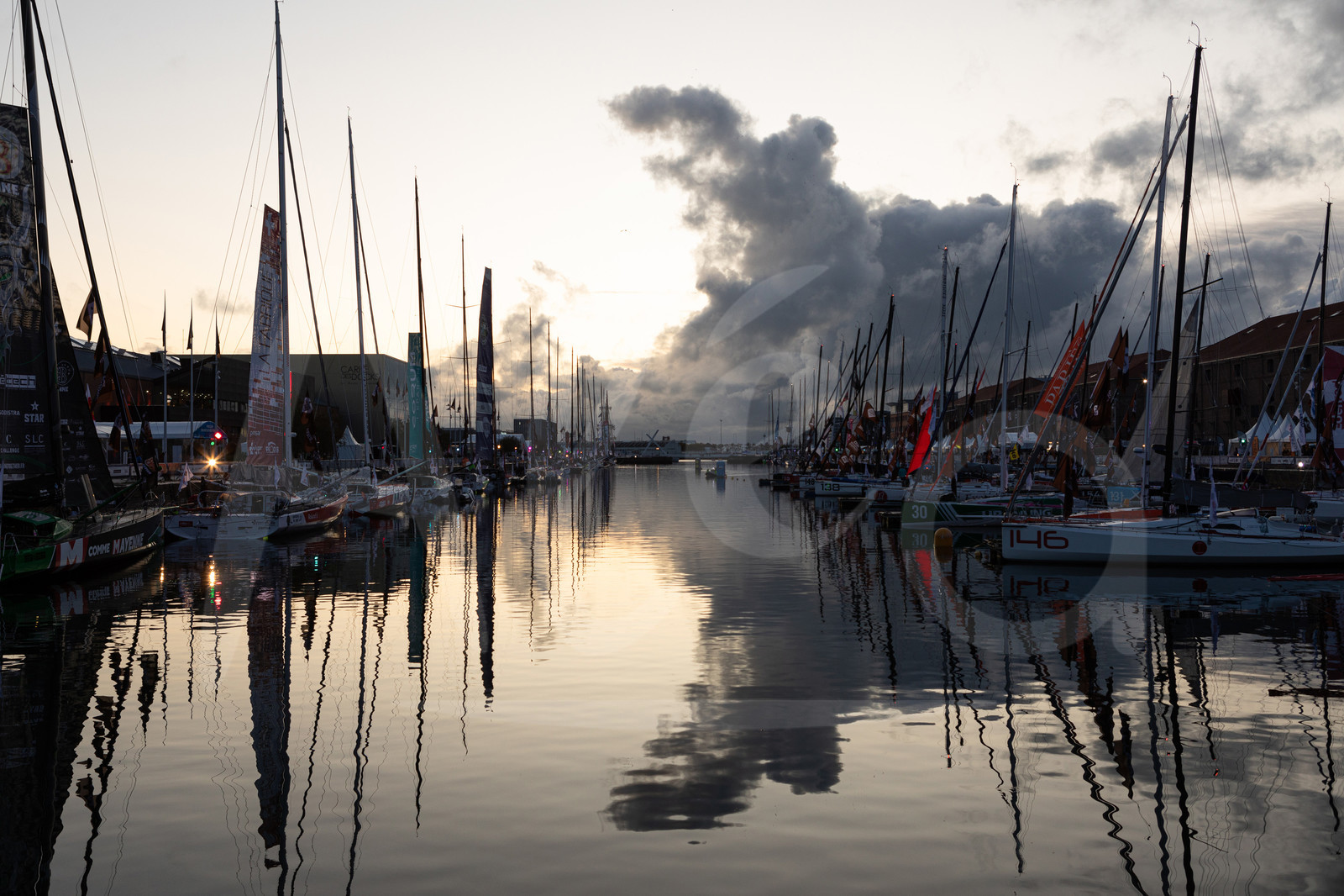 DescriptionLE HAVRE, FRANCE - OCTOBER 21: Dusk is coming on the Bassin Paul Vatine, illuminating boats displayed during pre-start of the Transat Jacques Vabre 2019, duo sailing race from Le Havre, France, to Salvador de Bahia, Brazil, on October 21, 2019 in Le Havre, France. (Photo by Jean-Marie Liot/Alea)
